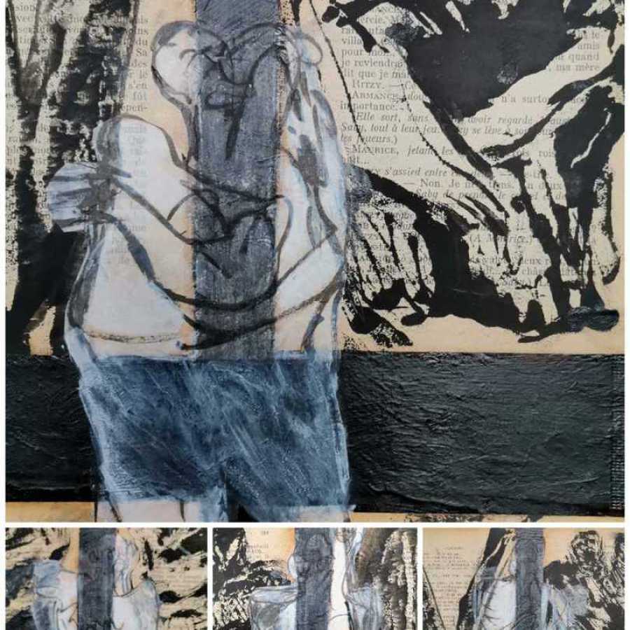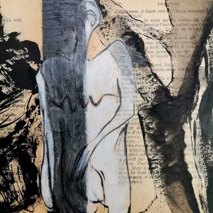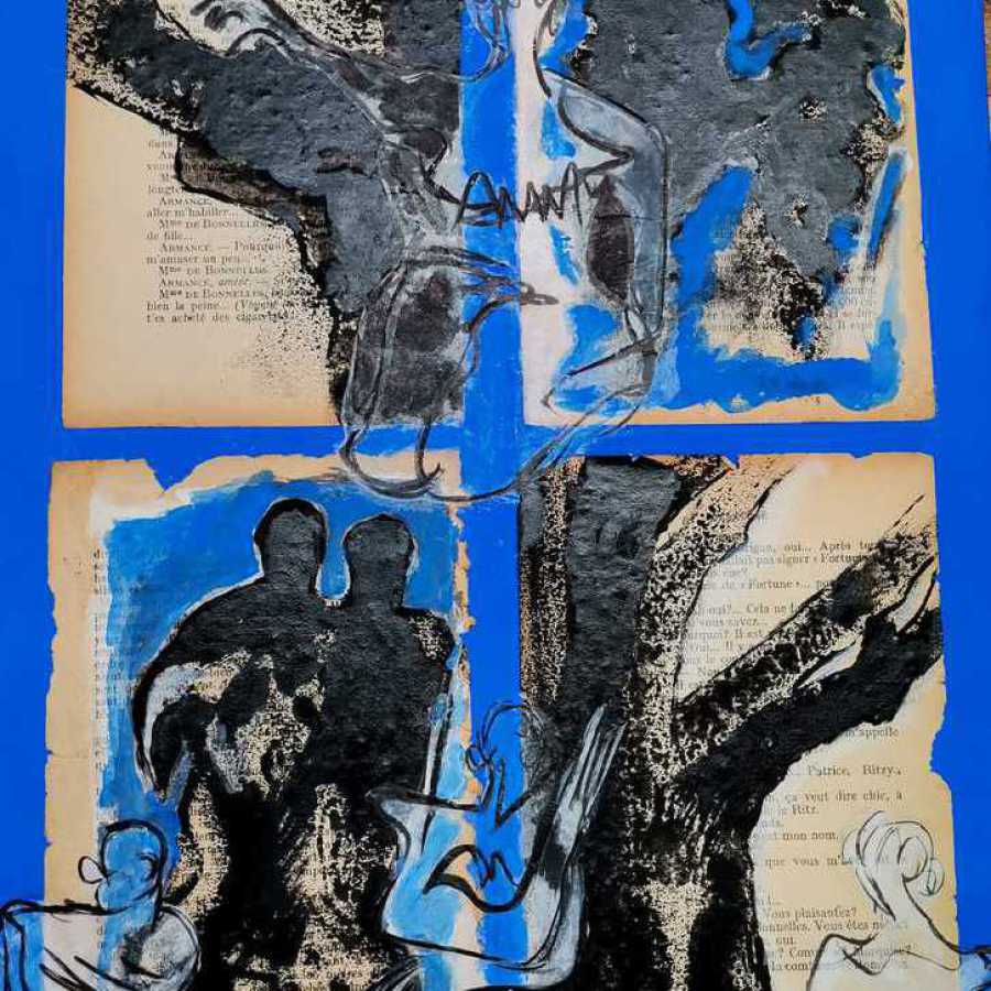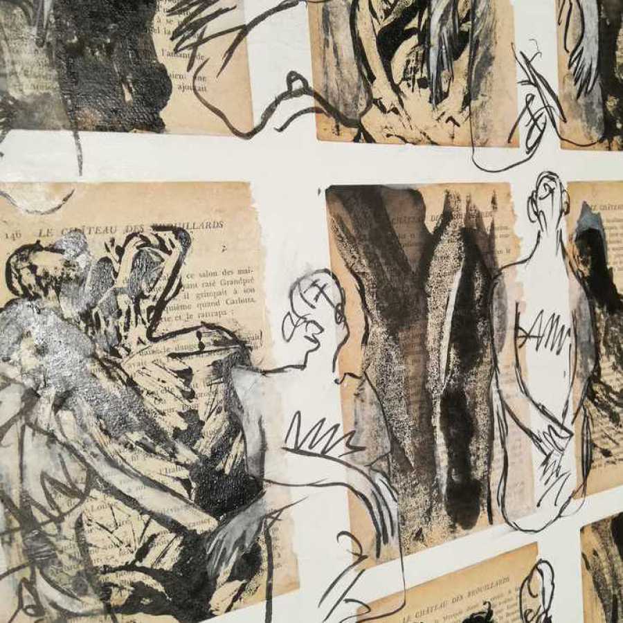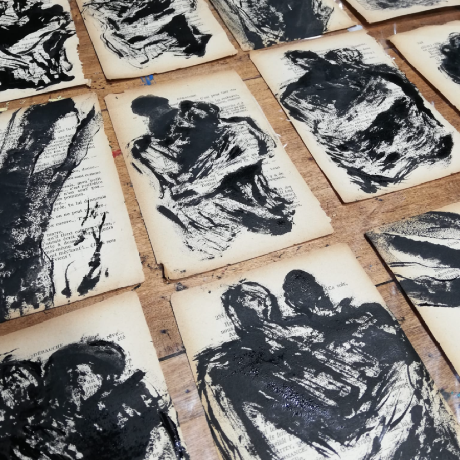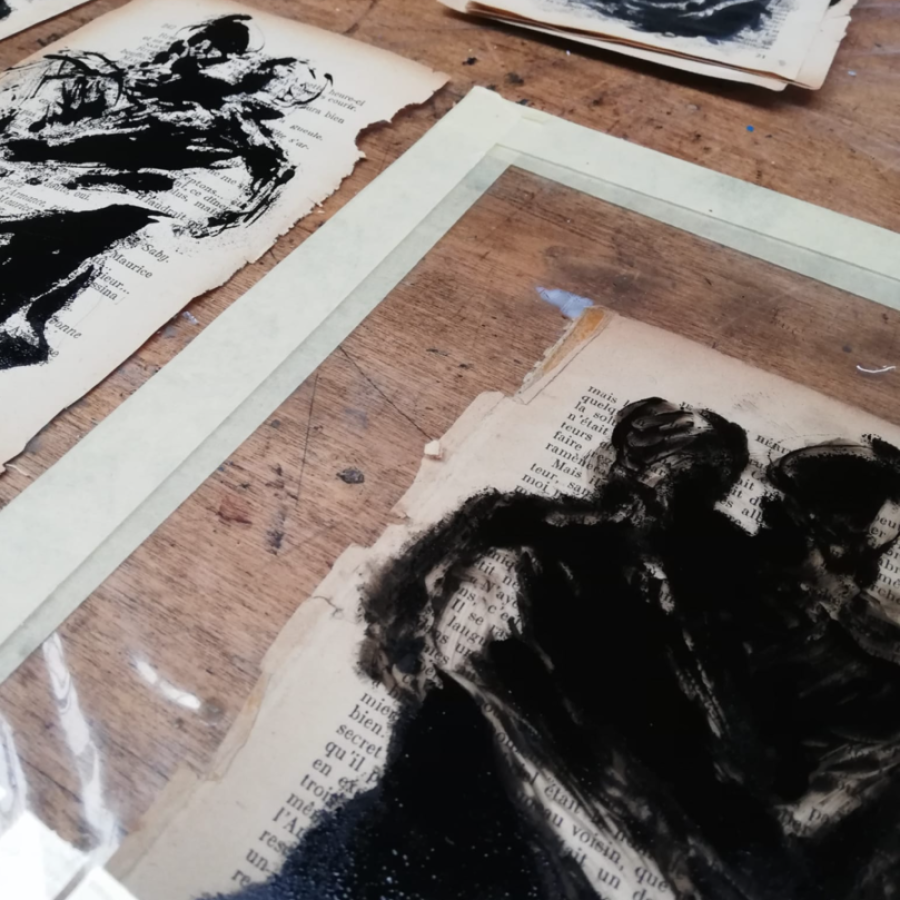 Dans l’infini des possibles, sur le fond du papier déjà imprimé, une histoire est racontée, vieux livres revisités, est posé un geste qui détermine une option : un événement graphique surgit, s’inscrit dans la matière, Corps/Accord, couple… Le monotype apparaît.