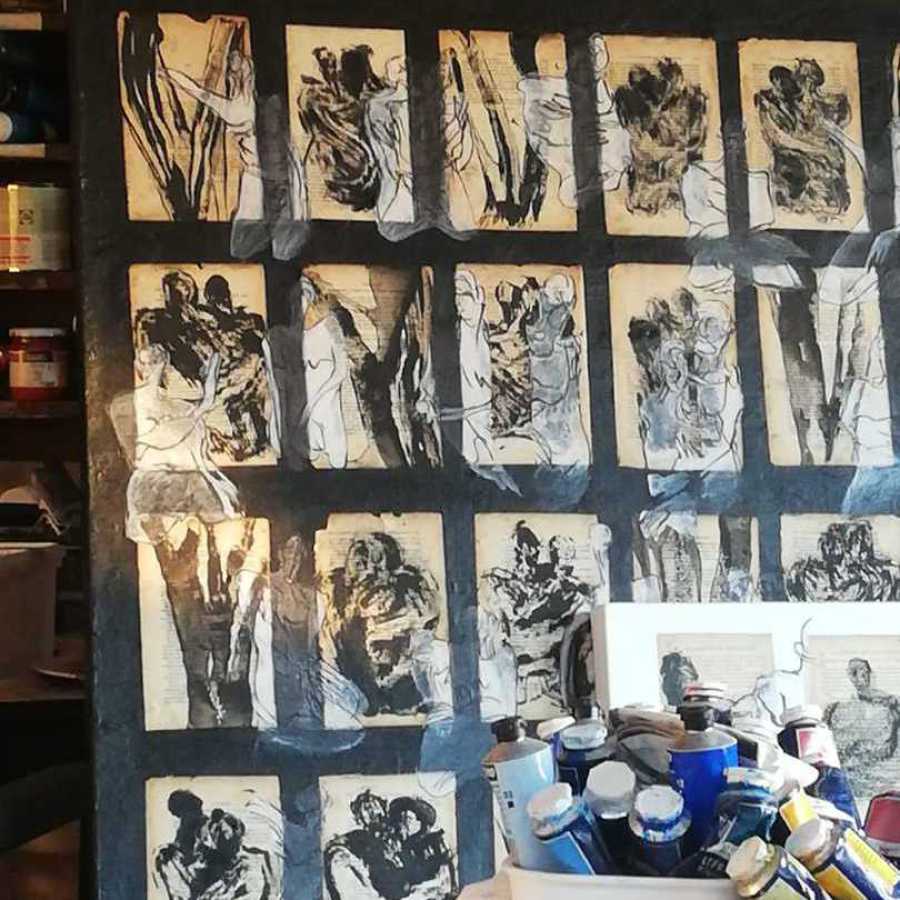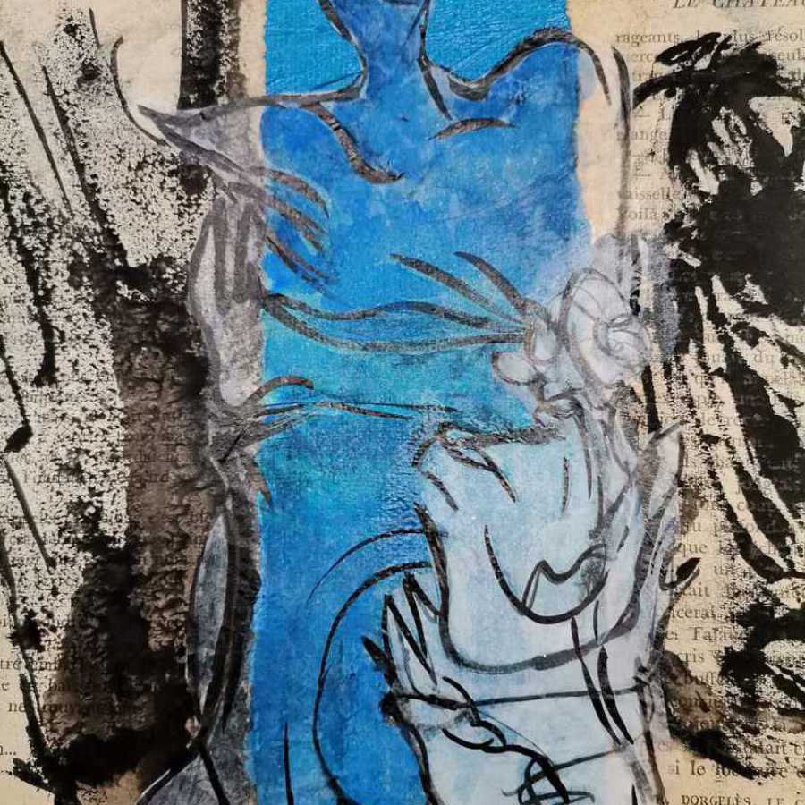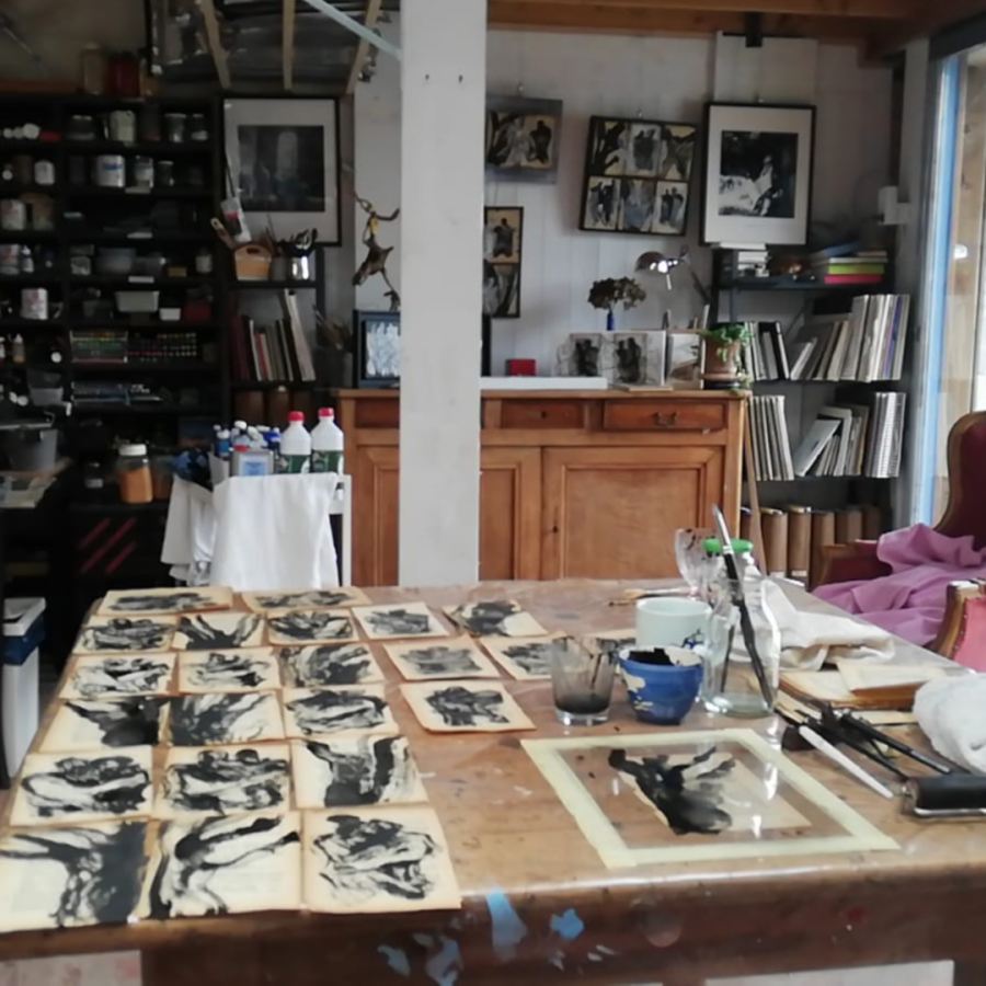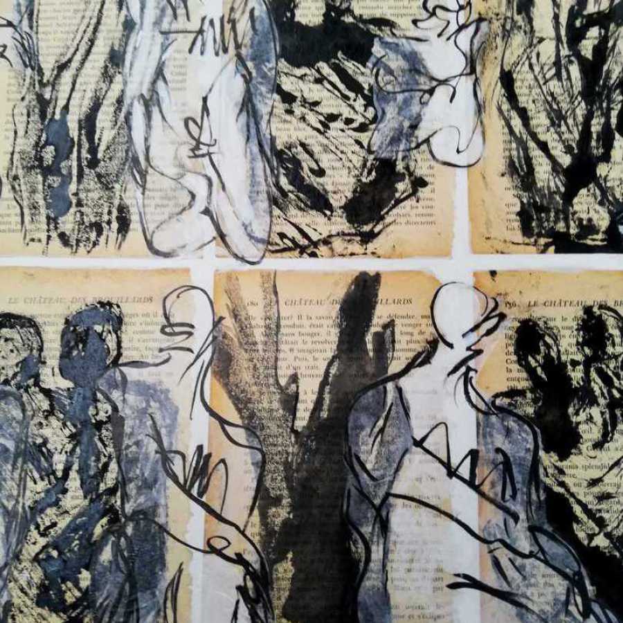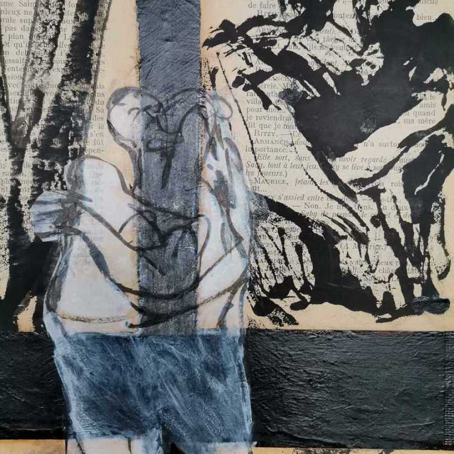 Dans l’infini des possibles, sur le fond du papier déjà imprimé, une histoire est racontée, vieux livres revisités, est posé un geste qui détermine une option : un événement graphique surgit, s’inscrit dans la matière, Corps/Accord, couple… Le monotype apparaît.